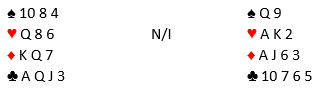 Nøtterøy 3 spilte sin første NM kamp parallellt med klubbkvelden i går, og det så riktig stygt ut ved halvtid med 55 imp i minus, men laget reiste seg mesterlig i 2. halvrunde og tok inn nesten 40 av poengene. Med en brukbar seier i neste kamp kan de likevel gå videre til tredje runde. Hadde våre klart å melde denne storeslemmen, ville det vært nesten helt jevnt: