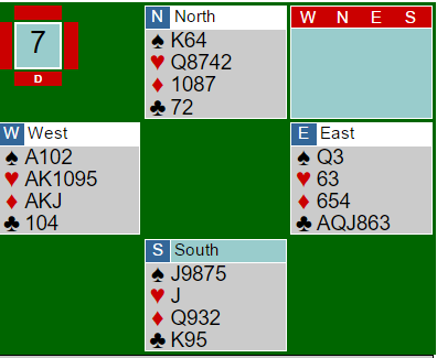 4 kløver og 4 ruter er cue bids, og 5 kløver viste tre ess. 5 ruter spør om trumfdamen er til stede, og med den på plass kunne Svein H legge kontrakten i 7 hjerter.