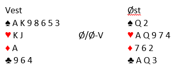 Men det er en hake ved storeslem i spar. I 7 grand kan hjerteren spilles før sparen, og spar dame kan brukes som inntak. Hvis nord skulle finne på å spille ut kløver mot sparkontrakt (spilt av vest) forsvinner inntaket til hjerterfargen. Da er en mulighet å spille på at hjerteren går (3-3 eller at tieren faller) ved å spille kongen og stikke over knekten etter å ha trumfet ut. Alternativt kan det tas en stor trumf fra vest, så K-J i hjerter og spar til damen. Da må trumfen sitte 2-2, eller syd må ha tre trumf (presser i så fall med stående hjerter mot syds siste trumf). Så med kløver ut er ikke 7 spar noen sikker kontrakt, men hvorfor skal akkurat kløver komme i utspill? I praktisk bridge er å melde seg opp i 7 spar et godt forsøk, spør du meg. Men kortgudene var ikke på Johansen og Grude sin side i dette tilfellet: