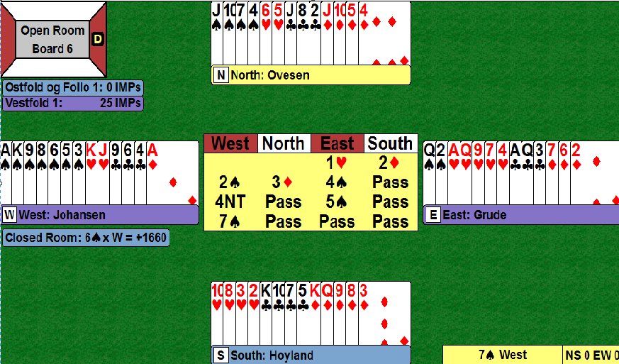 Som du ser av resultatet i lukket rom var det veldig nedslående for Vestfold og Follo. Der støttet ikke øst sparen idet nord hoppet til 4 ruter etter samme start som i åpent rom. Etter pass-pass over nords 4 ruter gamblet Siv Thoresen (vest) på 6 spar, og den hadde ikke nord noen tro på. Men da han spilte ut ruter hadde Thorsen ingen problemer med å vinne den doblede slemmen, +1660. Det ga Østfold og Follo hele 18 IMP!