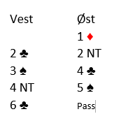 Da Bremnes kom tilbake med 3 spar var 4 kløver en fin melding fra Sandvik, basert i at svarhånden "vil noe" med sine meldinger, ikke bare vise sin 4-5 hånd. Østs kort er glimrende i kløverkontrakt (to ess og trumf dame), og det bør en makker få vite om! Dessuten er øst bekymret for hjerterfargen. 3 grand spilt av øst behøver på ingen måte være tingen idet vest har vist ni kort i de svarte fargene. Hvis ikke svarhånden er sleminteressert er etter denne starten likevel 5 kløver ganske sikkert en fin kontrakt, og om makkeren har slemambisjoner har åpneren de riktige verdiene. Østs 4 kløver var perfekt beskjed for vest, og via Key-Card Blackwood meldte han 6 kløver.