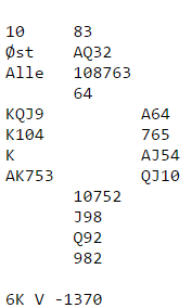 Merk at 6 grand som de fleste meldte er en klart dårligere slem. Den avhenger av hjerter ess foran, og da det ikke var slik gikk de som var i 6 grand bet. I kløverslem spilt av vest er det en ekstra sjanse. En hjerter kan kastes hos vest på ruter ess, og underveis kan spillefører trumfe en ruter for om se om damen sitter tredje. Gjør den ikke det er hjerter ess foran neste sjanse. Denne gangen ble ruter knekt godspilt etter en ruterstjeling, og enda en hjerter til kunne senere kastes fra vest på ruter. Dermed ble det tolv stikk uavhengig av hvor hjerter var plassert, og fortjente IMP etter en god og logisk meldesekvens.