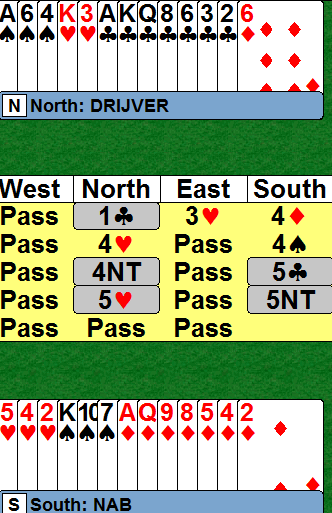 Da syd meldte 4 ruter ble det vanskelig for nord. Sluttkontrakten 5NT var forfor høyt, og Ø/V fikk tak i bet etter det gode utspillet spar 9 (!) fra Tøndel.