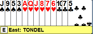 Ved det andre bordet hoppet også øst til 3 hjerter, men der besinnet Per Erik Austberg seg som syd og passet. Da Jan Tore Berg kom tilbake med 3 grand måtte han selvsagt tenke seg godt om med sisse sydkortene, det kunne jo stå slem. Men da han disiplinert passet ble det vunnet utgang og 11 IMP til Heimdal.