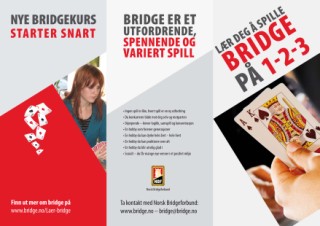 LÆR BRIDGE PÅ 1-2-3 INFORMASJON OM ”LÆR BRIDGE PÅ 1-2-3” Både plakater (A3 og A2) kan fås tilsendt gratis ved henvendelse til bridge@bridge.no. Ønskes en mer personlig vri kan en laste ned de redigerbare filene fra denne siden. Bruk en god fargeskriver. Redigerbar pdf plakat A3 Redigerbar pdf av folder "Lær bridge på 1-2-3"
