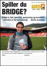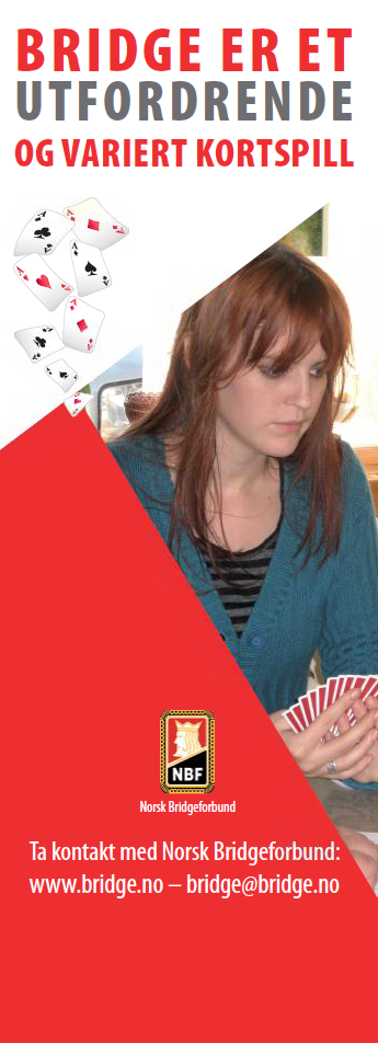 3 x roll up Roll up'ene er ca 90 cm x 2 meter i opprullet tilstand. Roll up'ene lånes ut gratis. Vi har tre sett á 3 roll up, og låner ut etter "Først-til-mølla"-prinsippet. Den som låner forplikter seg til å sende roll up'ene videre til neste klubb som ønsker å låne dem. Send e-post til bridge@bridge.no for å reservere. Klubber som vil lage sine egne roll up kan laste ned pdf av roll up'ene. OBS, stor fil. 2 x roll up Verv en Bridgevenn