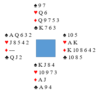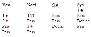 Starten ser tilforlatelig ut, bortsett fra nords 1 grandmelding uten sparstopper, kanskje? Forklaringen er at over kunstig 1 kløver (dette var polsk 1 kløver) viser Bachs (vest) 1 spar enten ruterfarge, eller begge major (såkalt Suction). Da han i neste runde kom tilbake med 2 hjerter hadde han fortalt om begge major. Og der skulle nok meldingene dødd ut, en sunn kontrakt. Mange lar seg tydeligvis provosere av denne konvensjonen, og de vil liksom ikke la seg bli utmeldt. Syds dobling er i beste fall en gambling. Da nord foreslo 3 ruter var katastrofen etablert for N/S, og Cornell ga det som normalt er nådestøtet i sånne spill med sin dobling.