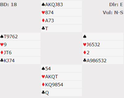 Grime-Allard spilte 3 grand hvor det var ingen problemer. Etter å ha lasjert ruterutspillet var det bare å sette opp ett ekstra stikk i hjerter, og kontrakten var sikker.