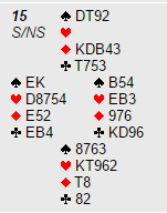 Det var ikke så unaturlig å ende i 4 hjerter som Ø/V, normalt en bra kontrakt . Men med den fæle trumfsitsen var det ikke så lett etter ruter konge i utspill. Vidar Smith vant den likevel etter nøyaktig spill, bl.a må utspillet lasjeres. Senere oppdages hjertersitsen etter liten mot A-J, og syd får ikke mer enn to hjerterstikk. Vests andre rutertaper kastes etter hvert på østs fjerde kløver.