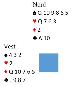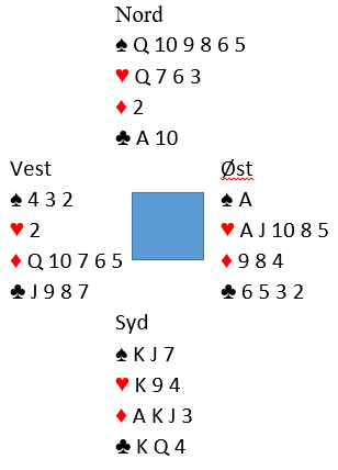 Ved det ene bordet stoppet N/S i 4 spar. Ved det andre kom N/S i 5 spar. Vest skulle spille ut og valgte sin single hjerter. Nords hånd kom opp som blindemann: