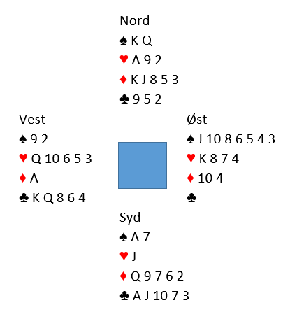 Det som skjedde kan nok øst se for seg, så hjerterskiftet gir i alle fall ikke mening. Skifter han til trumf så vinner vest med det single esset og kan fri seg med et majorkort. Ett stikk i kløver gir senere beten.