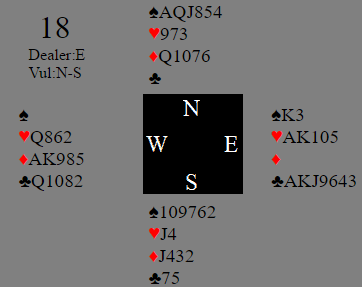 Her var det storeslem på gang! Øst åpnet, og overalt kom nord med i meldingene, flere steder med en sperremelding. Idet øst viser revershånd (for eksempel etter 1 rutersvar fra vest) får vest enorme kort. En eventuell slik meldesituasjon kan du diskutere med din faste makker. Hvis dere ikke finner slem i det hele tatt blir det "katastrofe"-spill, kun tre av 53 lag var bare i utgang. Selv om det spilles lilleslem kan godt spillet tapes om det spilles i en turnering som NEC-Cup. Det ble meldt storeslem ved 17 bord, de resterende 33 Ø/V-parene spilte lilleslem. Scorene varierte fra +100 N/S (ett Ø/V-par hadde en splintermisforståelse og spilte ruterkontrakt!), via utgang, lilleslemmer i kløver og hjerter (noen var doblet) til +1440 Ø/V i 7 kløver. Storeslem i kløver er overlegent bedre enn 7 hjerter hvor man blir avhengig av at hjerteren ikke sitter skjevt. Lederlagets Bareket-Lengy tok toppen. De var heldige da de meldte storeslem med den litt farligere trumfen, hjerter. Da N/S doblet 7 hjerter ble det den uvanlige scoren +1770!