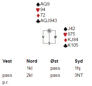 Syd har blitt spillefører i 3NT etter meldingsforløpet over.