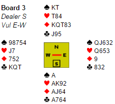 Ingen i verden kan klandre vest for å spille ut kløver konge. Da ble det bare en kløvertaper, og syds fjerde kløver ble god og ga hjerteravkast fra nord- tolv stikk. Ware og jeg stoppet i 3 grand, N/S ved det andre bordet meldte og vant 6 ruter. Det ga 11 IMP ut i stedet for 11 IMP inn om slemmen hadde gått bet - 22 IMP i sving.