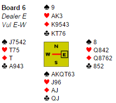 Det er nok en dårlig slem hvor det veldig ofte vil bli to kløvertapere, eller en taper i hjerter og en i kløver. Men kortgudene hadde plassert Ø/V sine kort gunstig for de som meldte 6 ruter spilt av syd: