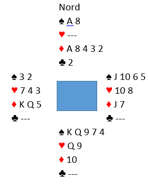 Ta ut trumfen og spille tre ganger kløver (eliminasjon) før du frir deg i ruter. Syd kommer inn og spiller for eksempel spar 10.