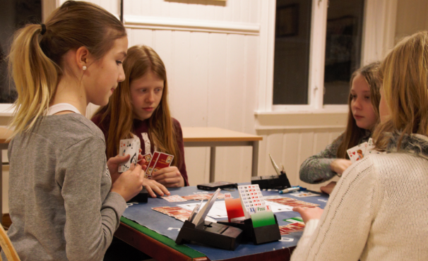 Fire mandager i februar har 7. klasse ved Steinerskolen i Trondheim hatt tilbud om å lære bridge. Inger Hjellemarken og Ole Jonny Tøsse har arrangert lynbridgekurs en times tid i klasserommet etter skoletid. Sånn ca. likt med gutter og jenter som deltok. Medlemmer fra bridgeklubbene i kretsen assisterte under kurset. Elevene har lært å ta stikk, rangere farger, telle honnørpoeng, enkle åpnings- og svarmeldinger og føre enkelt regnskap.
