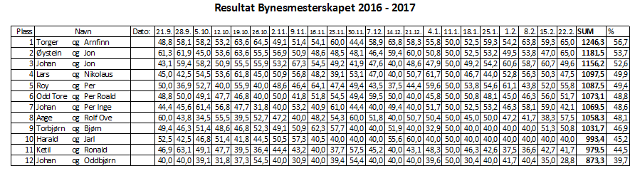 Her er sluttresultat for Bynesmesterskapet 2016-2017: