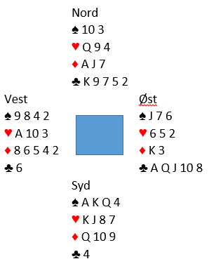 Et eksempel fra Gressvik BK på mandag. Studer først bare Øst sin hånd og meld den. Vest giver og Ø-V i faresonen.