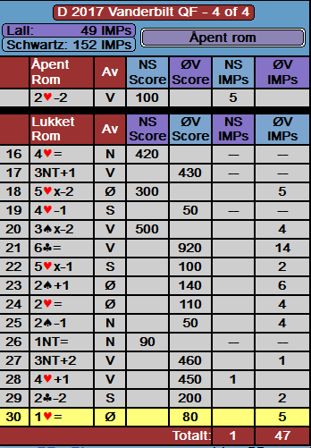 Avslutningen av Brogeland og Lindqvist sitt lag SCWARTZ sin kvartfinale i Vanderbilt (se forrige artikkel) ble ydmykende for deres til vanlig sterke motstandere på lag LALL. Sluttresultatet ble seier til det norske parets lag med hele 103 IMP. I det siste settet spilte våre gutter bunnsolid, og seieren var aldri truet. Her er listen deres i det siste settet (av fire):
