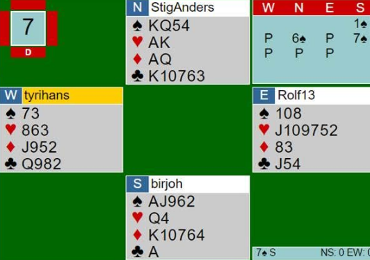 Ganske sprekt av uerfarne spillere må jeg si, men egentlig temmelig logisk også! Nord legger sammen det han har og smeller til med det han tror kan stå, 6 spar. Syd har ekstra, og med to ess må vel nesten 7 spar stå etter makkers usedvanlige svarmelding? Godt vurdert!