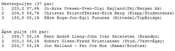 Simen og Hans Olaf vant sammenlagt med 344,23% foran Marianne og Karen med 331,4 på 2.plass og Arne og Roar med 315,4% på 3.plass. Neste torsdag starter imps-across-the-field, så da gjelder det å få frem lagkampegenskapene.