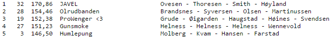 2. 227,5 Per Hafnor (4) - Ida Novik Nilsen (2) / Johnny Hansen (1) / Tone Mikalsen (1)