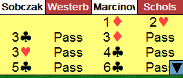 Westerbeek hadde nok ikke ett av sine beste øyeblikk da han spilte ut hjerter knekt mot 6 kløver. Et utspill er et utspill, greit nok, men jeg har i alle fall sansen for å spille ut spar ess i en slik situasjon. Idet blindemann kommer ned (øst ved det bordet) og i dette tilfellet forteller det meste kan det ikke være noen hensikt i å spille noe annet en mer spar. Håpet blir at makker har K-10 dobbel, eller singel tier - en bet. Men da han altså valgte hjerterutspill føk slemmen hjem. Ruterfargen ga avkast for alle vest sine tre spar. Dermed ble det Polen som tok ledelsen 9-0 i stedet for at Nederland kunne vunnet spillet stort. Men til slutt var det alså Nederland som trakk det lengste strået.