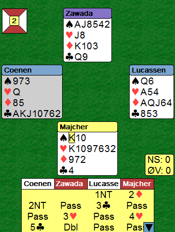 Nederlandske Coenen følte nok han var heldig her. Han hadde etter makkerens svake grandåpning stoppet i 3 kløver, men da motparten meldte 4 hjerter sa han 5kløver. som ble doblet, og spillefører var øst (etter 2NT som overføring). Syd fant et godt utspill i spar konge, men da han ikke kunne trumfe over åtteren tredje runde spar var kontrakten enkel å vinne siden ruterfinessen gikk, +550 til Nederland. Her har vi kanskje fått en god start, tenkte nok Coenen og Lucasse...