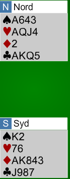 Som syd var vår venn havnet i den gode slemmen 6 kløver. Den har veldig bra sjanser selv om hjerterfinessen skulle ryke.