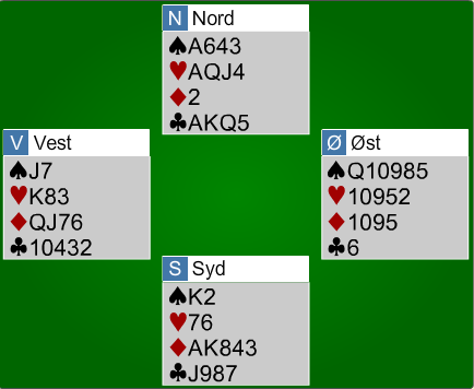 Mot 6 kløver spilte vest ut spar knekt. Den ble stukket med kongen, så ble hjerterfinessen tatt i andre stikk. Den holdt, og det så lyst ut, faktisk kunne det kanskje bli overstikk nå. Fortsettelsen var kløver ess fra bordet, og sekseren kom fra øst, Nå tok han nok en stor kløver fra nord, men da kastet øst en spar så det var kanskje ikke helt rett frem likevel