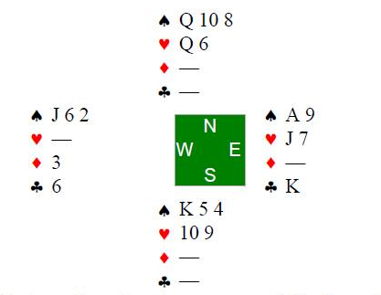 Det spilles fem runder ruter, kløver ess og kløver til damen. Da blir situasjonen seende slik ut: