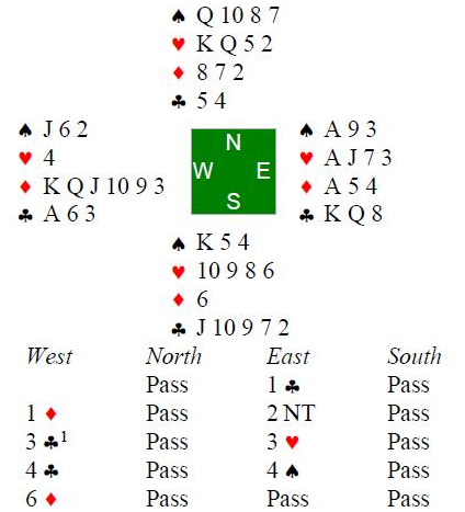 Vest var altså i den hardmeldte slemmen 6 ruter, og nord spilte ut hjerter konge til østs ess. Kontrakten vinnes på denne måten: