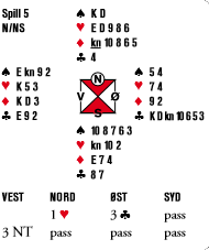 Der ruter kom ut mot vests 3 grand vant syd med ruter ess og la hjerter knekt på bordet. Dermed tok forsvaret de seks første stikkene - to bet før spillefører fikk komme inn. Morsomt!