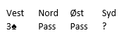 Alternativet er å doble. Det er mer fleksibelt. Kanskje har makker en spar «stack» og kan passe. Kanskje kan makker melde 5 i minor som trolig er bra om han gjør det. Kontrakten kan vel kanskje også hete 3 grand.