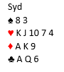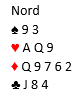 Det kommer ruter dame ut vunnet av vest mot den ambisiøse kontrakten 7 grand. For å vinne må nok normalt sparen sitte rundt. Det koster kansje ikke noe å toppe hjerteren først? Siden den da gir fire stikk slik det sitter er det tolv via en ganske markert kløverfinesse. Spillefører tar først de fire hjerterstikkene. Da er dette igjen: