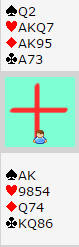 Da blindemann kom ned var jeg fornøyd, 7 hjerter er en god kontrakt. Hvis trumfen sitter 3-2 er kontrakten nedlegg, en ruter- eller kløverstjeling gir det femte trumfstikket og det er tretten enkle. Selv om hjerteren sitter 4-1 er det sjanser om øst har singel tier eller knekt. Jeg tenkte på å si 7 grand, men trodde et stjelestikk på en av hendene kunne være det trettende. I 7 grand er det mer som må sitte, så jeg var altså ganske fornøyd - i ca. to sekunder...