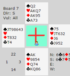 Mot oss hadde vest større ambisjoner. Etter at Faith hoppet inn med 3 kløver over østs 1 spar gikk vest litt berserk og stoppet ikke før 7 grand! Om den står er det nok litt flaksbetont. Det er enkelt om sparfargen sitter 3-3. Vår venn var ikke så heldig, og da han mistet kontrollen fullstendig endte det med tre bet.