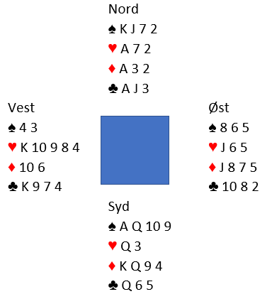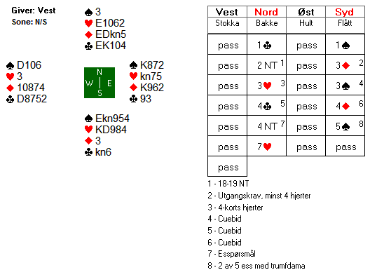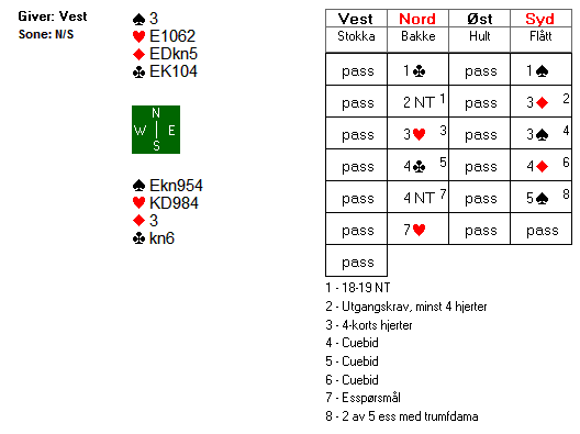 Det norske paret meldte seg altså helt opp i 7 hjerter. Christian Bakke har nok helt sikkert følt seg mer bekvem som spillefører, men når man kommer i en hardmeldt kontrakt er det bare å ta seg sammen og prøve å finne beste varianten som gir størst mulig sjanse for hjemgang.
