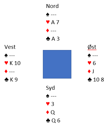 Vest spilte ut hjerter 9 som fikk løpe til damen. Nieren var konvensjonelt utspill som viste honnør-10-9, og øst la lavt. Da var det tolv stikk hvis ruteren ble løst. På fire runder spar gjorde øst en feil da han kastet hjerter knekt, kanskje for å hjelpe makkeren som ikke visste hvor knekten var. Men det avkastet kostet stikk, for nå var vest moden for skvis for det trettende stikket da ruteren ble løst med fire stikk. Før den siste ruteren så det slik ut: