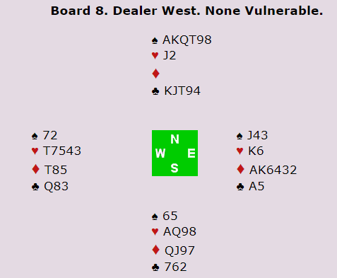 Sverre åpnet med 1 ruter og Arild svarte 2 ruter, alertert og forklart som omvendt minorhøyning, 10+ hp ruterstøtte og ingen 4- kort majorfarge. Sverre meldte så 2 spar, Arild 2 NT og Sverre 3 NT. De fleste stoppet da, men Arild gjotde et slemforsøk med 4 ruter. Fra Johnsen kom da kontrollbudet 5 kløver og det endte med kontrakt 6 ruter.