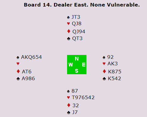 Jahnsen var giver og Nord- Syd i faresonen. Det gikk to ganger pass til meg og jeg åpnet med 1 kløver (2+, vi bruker 5-5-4-2+ system for fargelendger) Nord gikk innpå med 1 spar (normalt 5+ og 10-15 hp) og Jon støttet meg med 2 kløver. Syd hadde til 2 spar og jeg så at motparten trolig har høy kontrakt i spar, men hoppet mitt til 5 kløver var nok vel hysterisk. Nok om det, Nord ga seg ikke og meldte 5 spar som jeg hadde tenkt å stemle, men slik gikk det ikke, for makker dro opp 6 kløver som raskt ble doblet av Syd.