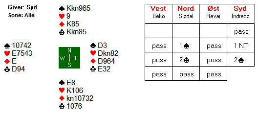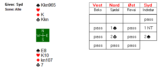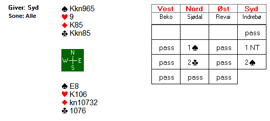 d.Sp A4- hj KDJ8- ru K5- kl A10983 og du starter budene. Her er det best å åpne med 1 kløver, melder makker 1 spar kan du reversere med gjenmelding 2 hjerter (vist 17+hp).