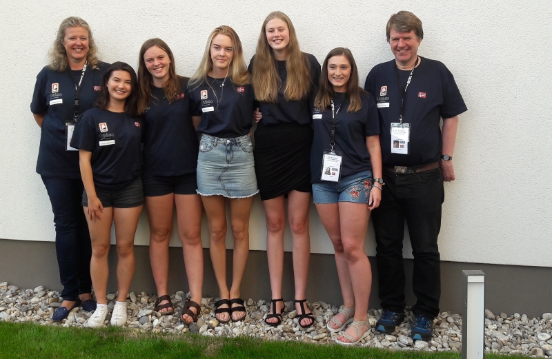 Forhåpentligvis får jentene ei bra avslutning på mesterskapet og sikrer plass i neste års VM. Fra venstre Elisabeth G. Sjødal (coach), Thea Indrebø, Agnethe H. Kjensli, Thea H. Hauge, Sofie G. Sjødal, Katarina Ekren og Sven-Olai Høyland (NPC).