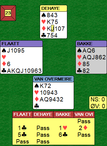 Bakke tok nok en sjanse da han løftet til lilleslem, det kan vel være en viss fare for to rutertapere etter disse meldingene (nord støttet ikke)? Men det kunne godt ha vært nedlegg, for eksempel om vest hadde hatt spar konge. Sånn som Ø/V sine kort så ut var lilleslemmen avhengig av spar konge i saks. Nord hadde to konger, men ikke spar konge...