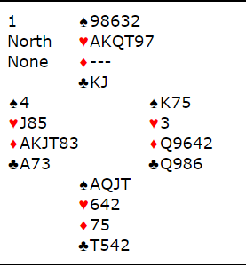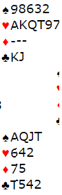 ! kl fra Nord med svar 1 hjerter og 1 NT gjenmelding. Så 2 ruter fra Syd, antakelig utgangskrav (XYNt?) og 2 hjerter fra Nord som lover 3 hj og max 3 kort i spar. Gjenmelding 3 hjerter fra Syd setter trumfen, er sterkere enn 4 hjerter og gjør klar for cue. Nord meldte 3 spar og så 4 NT fra Syd med svar 5 hj (2 ess, ikke hj D) og da Syd så hadde til 5 NT som bekrefter samtlige 5 kontroller (HJ K= ess) kunne Nord avslutte med 7 hjerter.