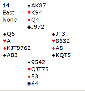 Franskmannen stakk utspillet med hj K, tok for kl A og spilte hj D til esset (muliggjør ekstra inntak om 2-2 imot i trumf). Så stjal han en kløver, tok for hj J og så spar til esset. På kl K stupte dessverre ikke damen, men kl 7 til stjeling ordnet godspilling av kl J. Spar til kongen, cash av kj J med sak av ru 10 men da ru AD var igjen på hånden uten flere mulighetyer for avkast måtte det spilles ruter til damen. Den holt for +1510.