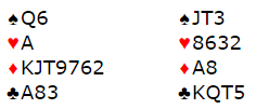 Med MUlti 2 ruter fra Tor Martinsen svarte Jan P. Johannesen 2 hjerter men da makker viste sterk hånd med 2 NT etterpå overførte han til hjerter (via 3 ruter) og gikk så via Blackwood til 6 grand. Gunnar Saxegaard- stoppet i utgang.