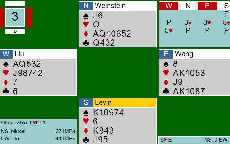 Levin (syd) passet, og etter pass fra vest også åpnet Weinstein (nord) med 3 ruter. Øst kan liksom ikke doble med singel spar og meldte inn 3 hjerter. Da syd smalt til med 5 ruter ble det riktig "tempo" på meldingsforløpet for N/S, mens Ø/V måtte ut å gjette. Vest sa 5 hjerter, og øst kunne ikke vite om det var basert i gode kort, eller om vest bare pushet da han støttet sin makker. Som du ser passet øst, og da de dermed hadde brent den opplagte slemmen var det 13 IMP i favør lag NICKELL.