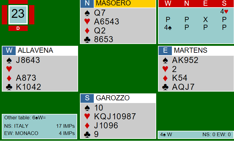 Kveldskampen i går var på papiret en storkamp mellom Italia og Monaco. Dessverre spilte ikke Monaco med Helness-Helgemo i den kampen, og da er Monacos lag i denne turneringen ganske ordinært. Italia tok umiddelbart kommandoen og ledet stort underveis i kampen, men Monaco fikk inn noen IMP mot slutten. Likevel vant Italia med 42-23.